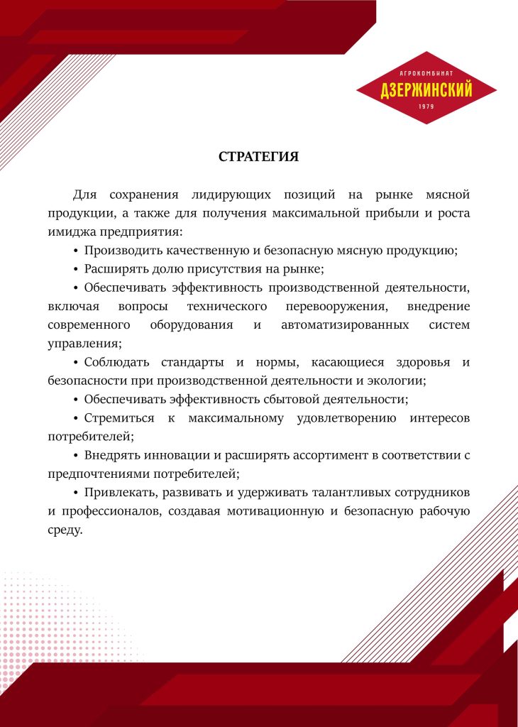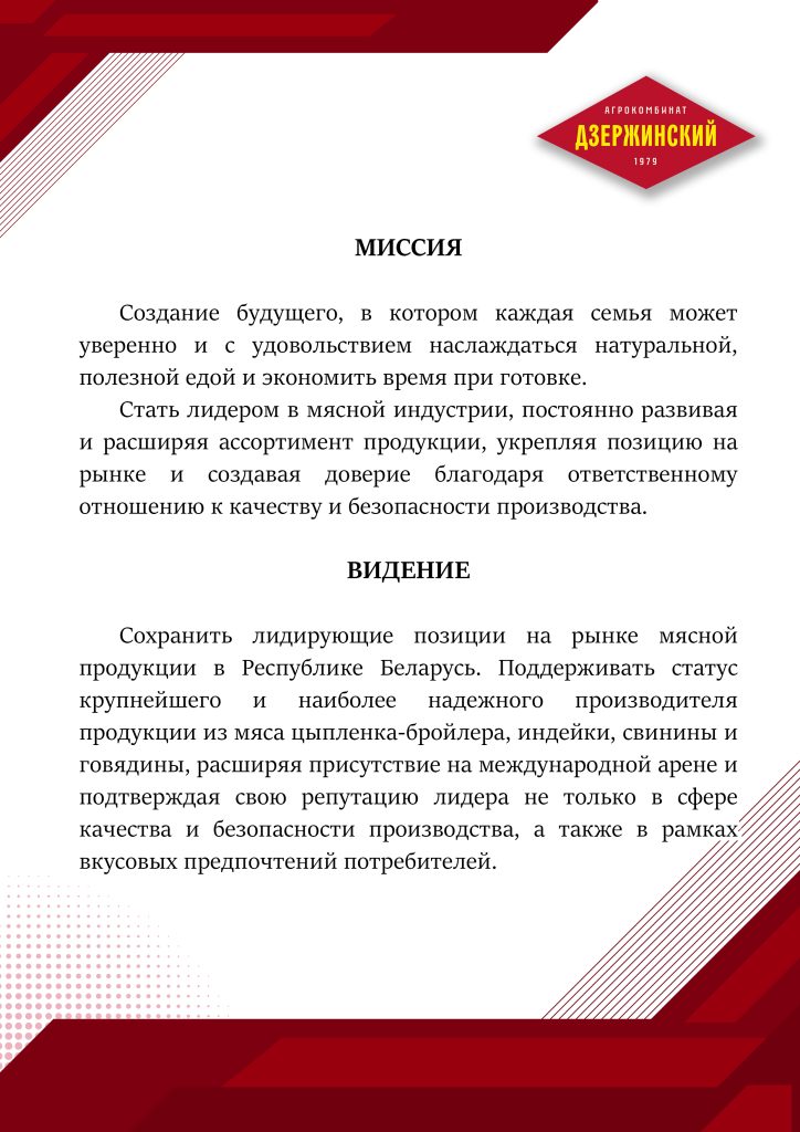 Замкнутый цикл производства от выращивания птицы и КРС до производства и реализации продукции глубокой переработки, полуфабрикатов и инкубационного яйца в своей торговой сети, а также в крупных торговых сетях Республики Беларусь. Стоит отметить, что реализация производимой продукции осуществляется не только на внутреннем рынке, но и за пределами Республики Беларусь.